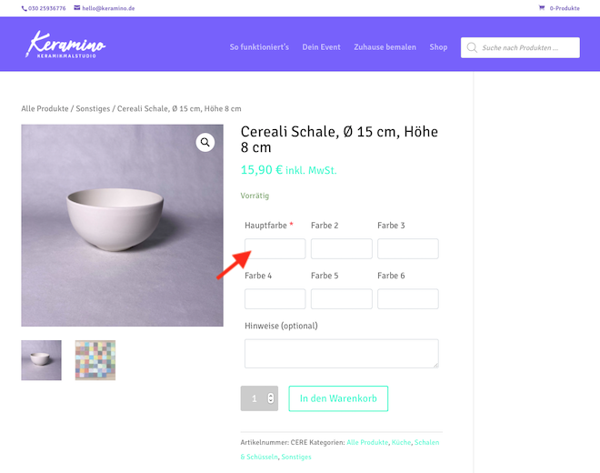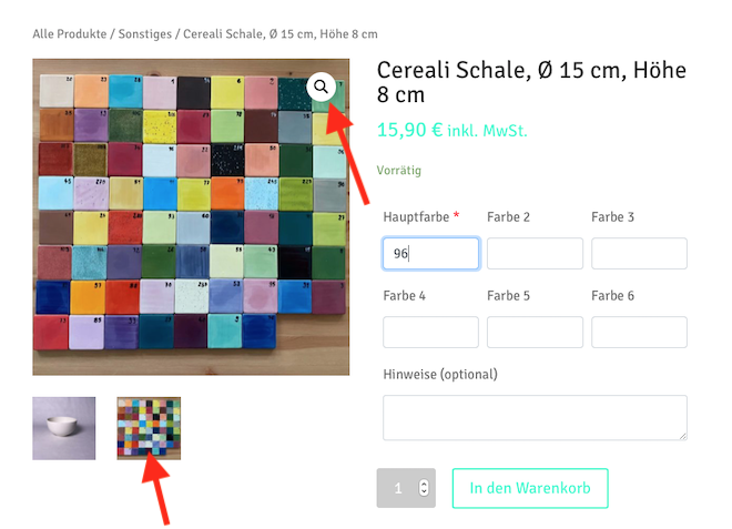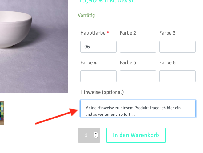 Solltest du einen Artikel mehrfach bestellen und ihn mit den gleichen Farben bemalen wollen, gebe alle Farben einmal an und ändere dann die Anzahl in dem kleinen grauen Feld links neben dem “In den Warenkorb” Button. Wenn du den Artikel zwar mehrmals bestellen willst, aber jedesmal andere Farben benötigst, lege den Artikel jeweils einzeln in den Warenkorb.